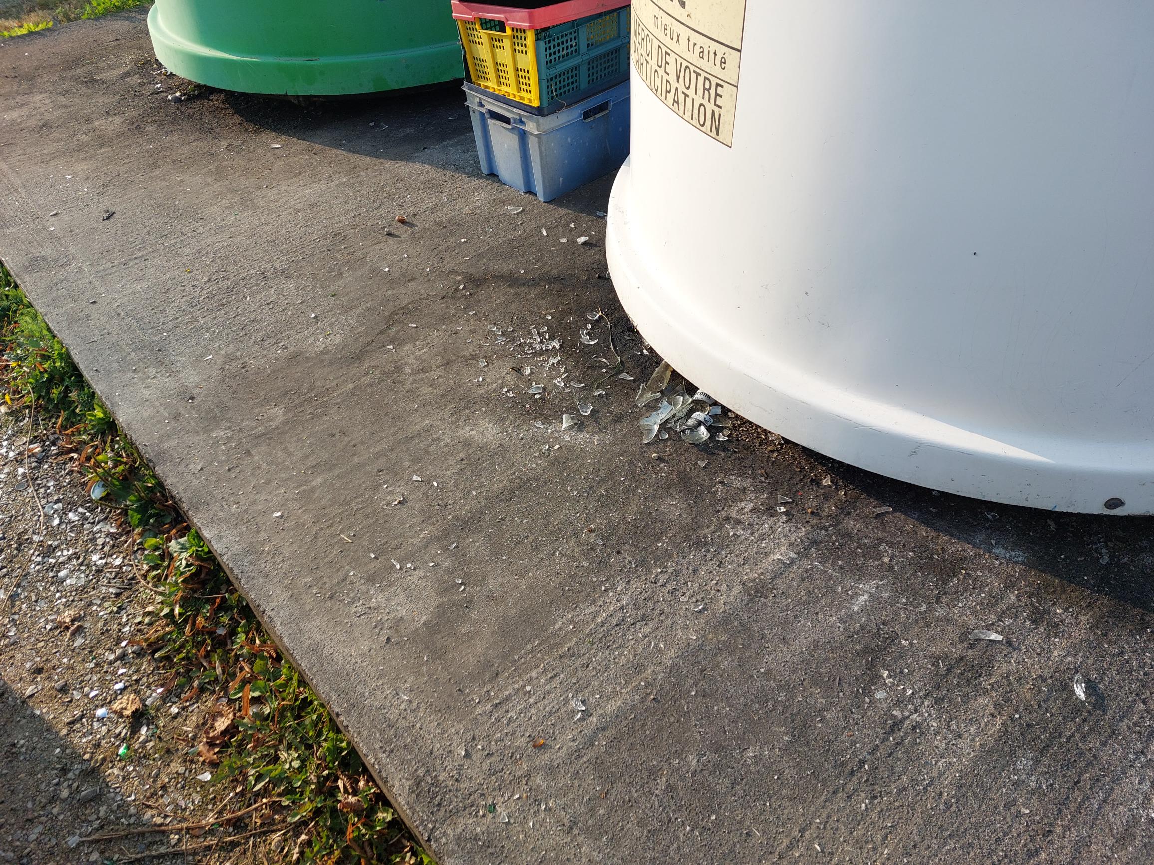 Ce qui me dérange dans ce que j’ai eu l’occasion de constater à FUMAL ce dimanche 10 octobre 2021, ce sont des morceaux de verre au pied de la bulle. Certainement un contenant qui aura échappé à quelqu’un. Ce qui me dérange aussi, c’est que les personnes qui sont parties en « oubliant » ces déchets, oublient que le temps consacré par nos ouvriers communaux à l’enlèvement de leurs déchets, et bien c’est du temps perdu pour d’autres tâches dans notre commune.